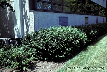 A very broad-rounded medium to large evergreen shrub with highly glossy convex leaf surfaces. Although this is one of the more cold hardy forms available, it is still marginally hardy in the central Illinois area.